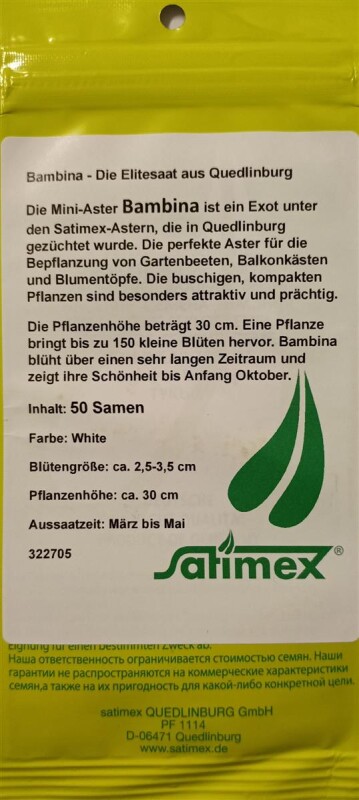 Die Mini-Aster Bambina ist ein Exot unter den Satimex-Astern, die in Quedlinburg gezüchtet wurde. Die perfekte Aster für die Bepflanzung von Gartenbeeten, Balkonkästen und Blumentöpfe. Die buschigen, kompakten Pflanzen sind besonders attraktiv und prächtig.