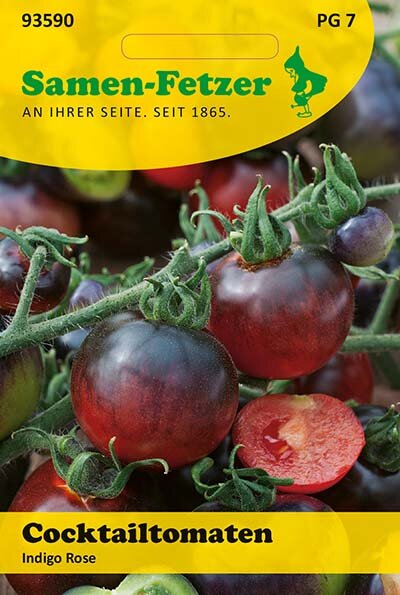 Indigo Rose ist die erste Tomate, die den natürlichen Pflanzenfarbstoff Anthocyan,durch die Einkreuzung von Wildtomaten besitzt. Anthocyan ist als besonders gesundheitsfördernd bekannt. Je nach Standort und Sonneneinstrahlung reift diese würzige Sorte in den Farben blau bis schwarz ab. Im Schatten oder unter den Blättern werden die Früchte rotviolett. Diese Sorte ist etwas Besonderes für das Auge und den Geschmack!